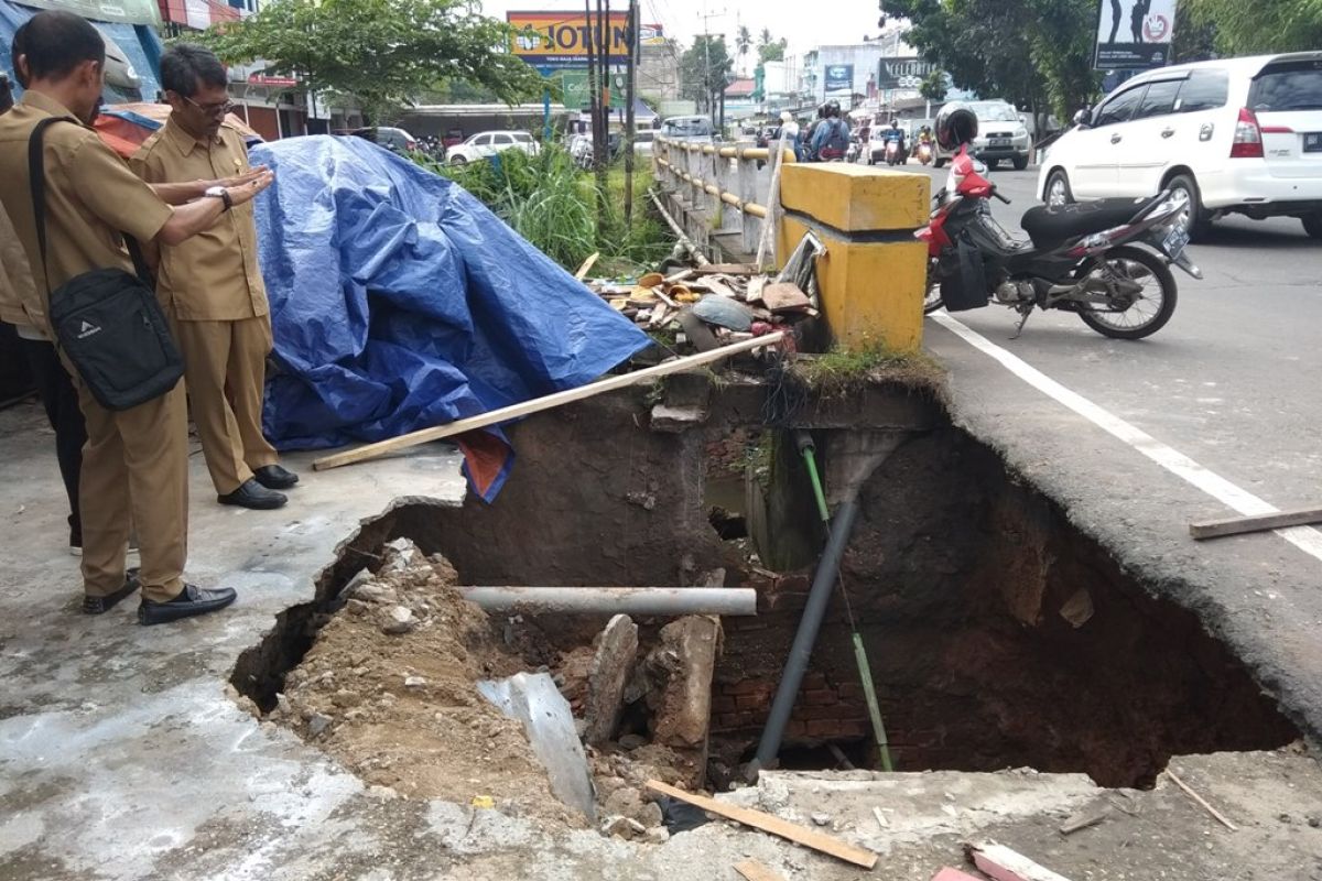 "Ya kemungkinan dari resapan air di gorong-gorong sehingga menggerus tanah di sana, akibatnya tanah ablas," kata salah seorang staf dari dinas pekerjaan umum setempat.