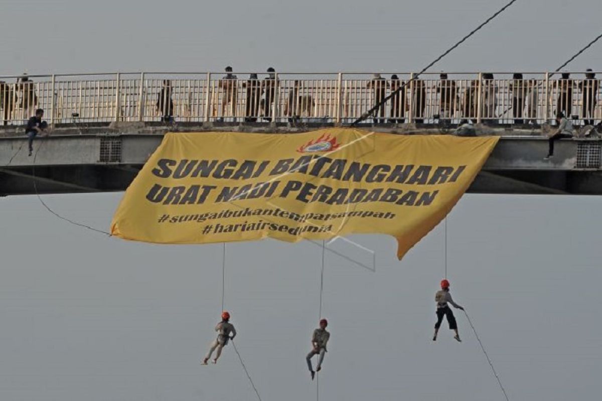 Anggota organisasi dan komunitas pecinta alam membentangkan spanduk kritik sambil disaksikan warga di Jembatan Gentala Arasy di atas Sungai Batanghari, Jambi, Sabtu (26/3/2022). Aksi tersebut guna mendukung aksi bersih Sungai Batanghari yang diikuti puluhan anggota organisasi dan komunitas peduli lingkungan di daerah itu. ANTARA FOTO/Wahdi Septiawan/aww.