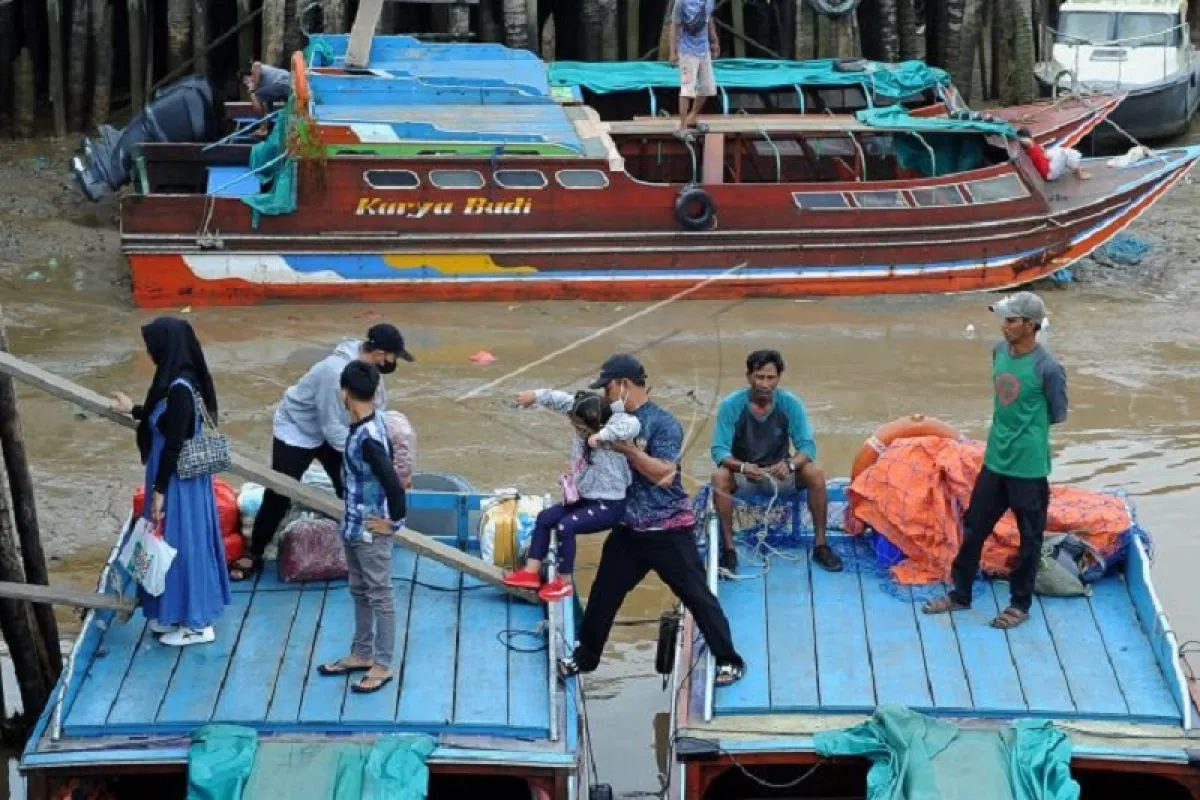 Pemudik berjalan di atap kapal cepat setibanya di dermaga Pelabuhan Kuatik Kuala Tungkal, Tanjungjabung Barat, Jambi, Minggu (17/4/2022). Sejumlah warga memilih untuk mudik lebih awal untuk menghindari terjadinya lonjakan penumpang dan kenaikan harga saat mendekati puncak arus mudik. ANTARA FOTO/Wahdi Septiawan/foc.