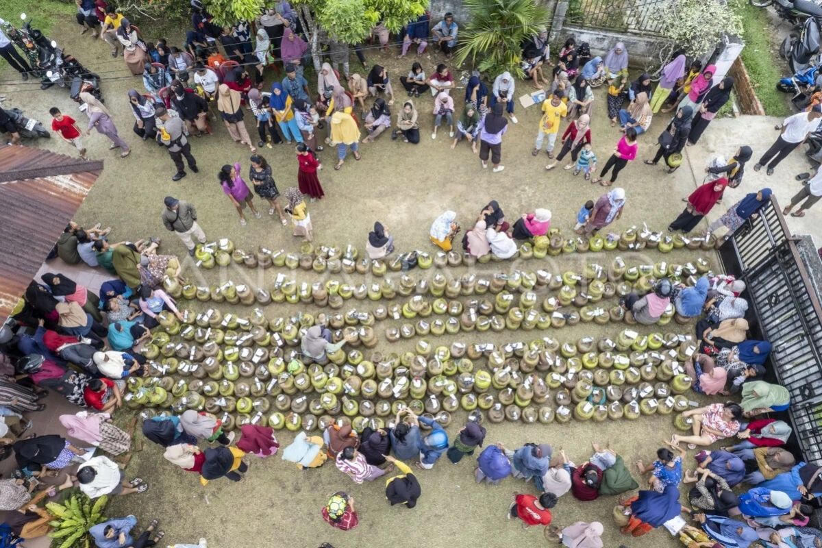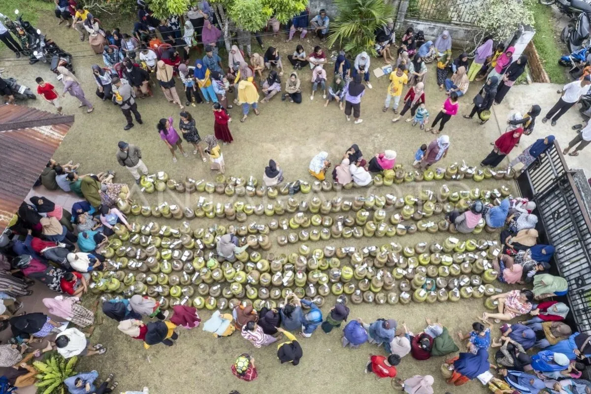 Foto udara warga mengantre untuk membeli gas elpiji 3 kilogram bersubsidi saat operasi pasar di Kenali Asam, Kota Baru, Jambi, Rabu (26/3/2025). Kegiatan yang difasilitasi Pemkot Jambi dengan menyediakan 560 tabung gas elpiji 3 kilogram dengan harga Rp17 ribu per tabung tersebut dipadati warga karena harga jual gas di tingkat pengecer atau warung setempat berkisar antara Rp40 ribu sampai Rp45 ribu per tabung. ANTARA FOTO/Wahdi Septiawan/nym.
