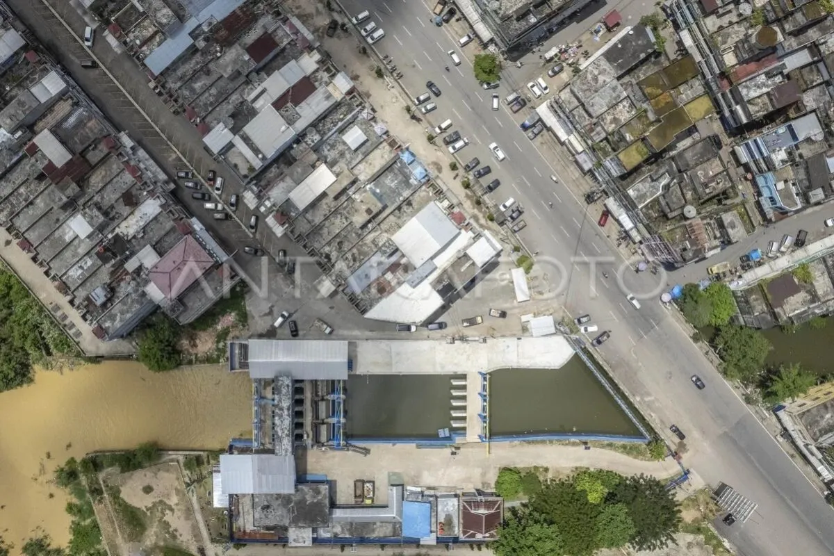Foto udara Stasiun Pompa Asam di hilir Sungai Asam dan kawasan pertokoan di Pasar Jambi, Jambi, Jumat (18/4/2025). Pemerintah Kota Jambi mengalokasikan dana sebesar Rp5 miliar yang didukung dana tambahan sebesar Rp25 miliar dari Pemerintah Provinsi Jambi dan Rp45 miliar dari Pemerintah Pusat untuk membebaskan lahan dan menormalisasi alur Sungai Asam sebagai upaya pengendalian banjir di kota itu. ANTARA FOTO/Wahdi Septiawan/YU