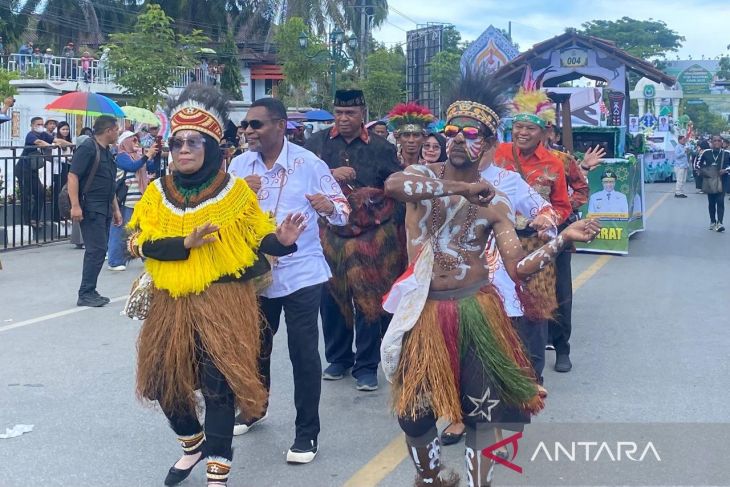 - Beberapa dari rombongan pawai provinsi itu dilakukan dengan menggunakan pakaian adat mereka dengan berbagai hiasan yang ditampilkan untuk memukau para tamu undangan dan masyarakat di Kota Kendari, Sultra.