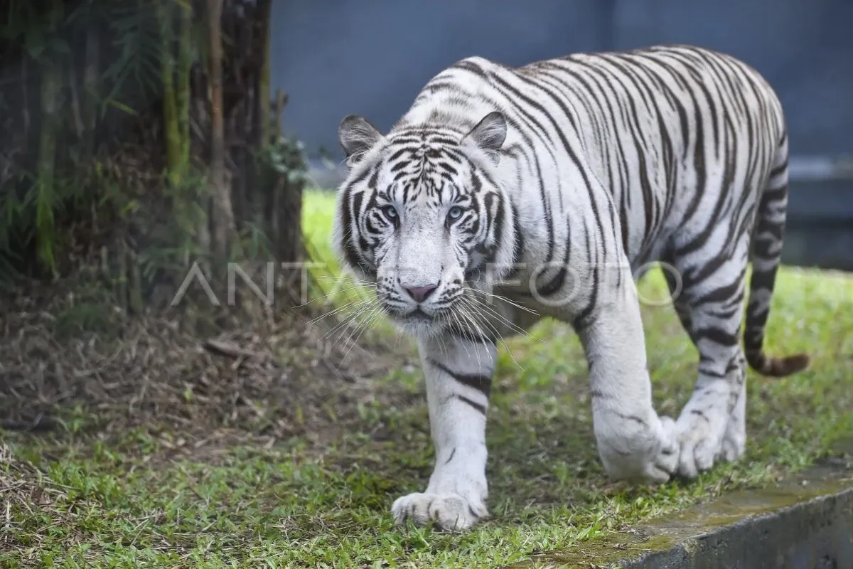 Seekor harimau Benggala (Panthera tigris tigris) jantan bernama Aden Jelatang berjalan di sekitar rumpun bambu dalam kandang Taman Rimbo Zoo saat resmi diperkenalkan untuk umum di Jambi, Rabu (15/10/2025). Taman Rimbo Zoo bersama Pemprov Jambi memperkenalkan kehadiran dua penghuni baru kebun binatang satu-satunya di Provinsi Jambi itu kepada masyarakat pada hari ini, yakni seekor harimau Benggala berumur 2 tahun yang didatangkan dari Lembang Park and Zoo dan seekor singa putih Afrika (Panthera leo krugeri) jantan bernama Mara Pijoan berumur 4 tahun dari Faunaland Ancol. ANTARA FOTO/Wahdi Septiawan/bar