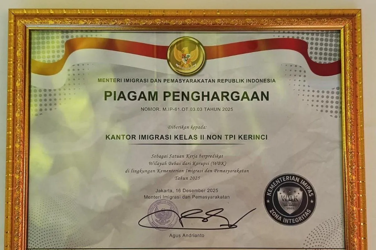 Jambi (ANTARA) - Kantor Imigrasi Kelas II Non TPI Kerinci kembali menorehkan prestasi membanggakan dengan berhasil meraih predikat Wilayah Bebas dari Korupsi (WBK) Tahun 2025.