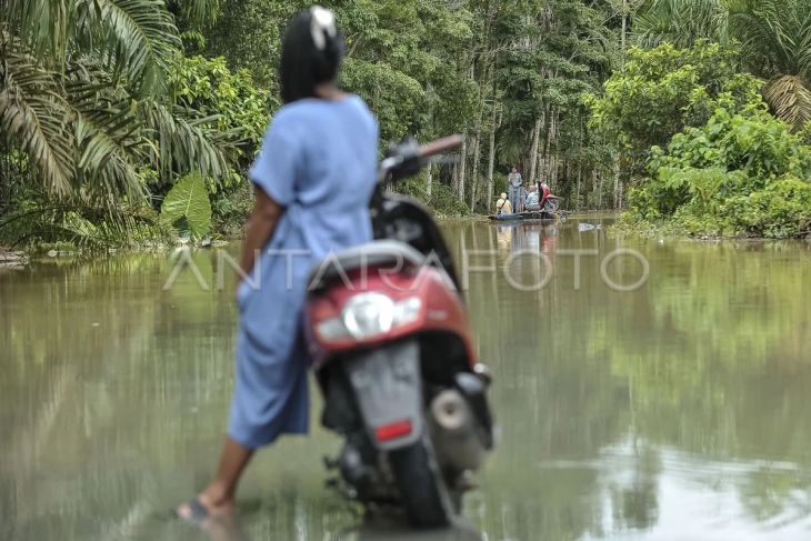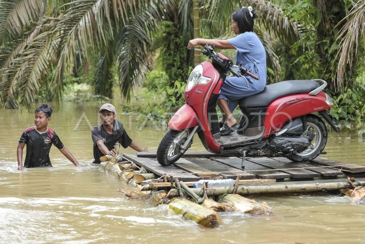 Warga menunggu antrean penyeberangan sepeda motor menggunakan rakit saat banjir luapan Sungai Batanghari merendam jalan di Desa Jati Belarik, Sumay, Tebo, Jambi, Minggu (9/3/2025). Warga mematok tarif Rp10 ribu untuk sekali perjalanan melintasi genangan banjir sejauh 1 kilometer lebih itu. ANTARA FOTO/Wahdi Septiawan/Spt.
