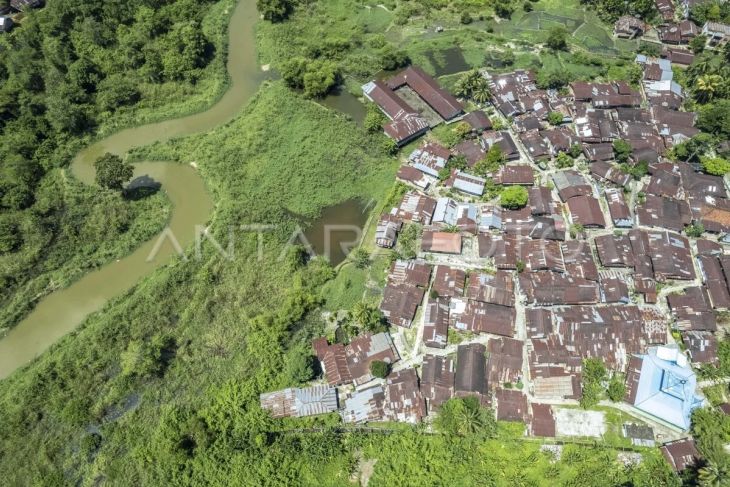 Foto udara alur Sungai Asam dan permukiman di kawasan Pasar Jambi, Jambi, Jumat (18/4/2025). Pemerintah Kota Jambi mengalokasikan dana sebesar Rp5 miliar yang didukung dana tambahan sebesar Rp25 miliar dari Pemerintah Provinsi Jambi dan Rp45 miliar dari Pemerintah Pusat untuk membebaskan lahan dan menormalisasi alur Sungai Asam sebagai upaya pengendalian banjir di kota itu. ANTARA FOTO/Wahdi Septiawan/YU