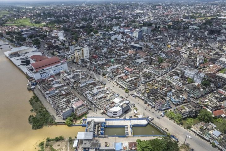 Foto udara Stasiun Pompa Asam di hilir Sungai Asam dan kawasan pertokoan di Pasar Jambi, Jambi, Jumat (18/4/2025). Pemerintah Kota Jambi mengalokasikan dana sebesar Rp5 miliar yang didukung dana tambahan sebesar Rp25 miliar dari Pemerintah Provinsi Jambi dan Rp45 miliar dari Pemerintah Pusat untuk membebaskan lahan dan menormalisasi alur Sungai Asam sebagai upaya pengendalian banjir di kota itu. ANTARA FOTO/Wahdi Septiawan/YU